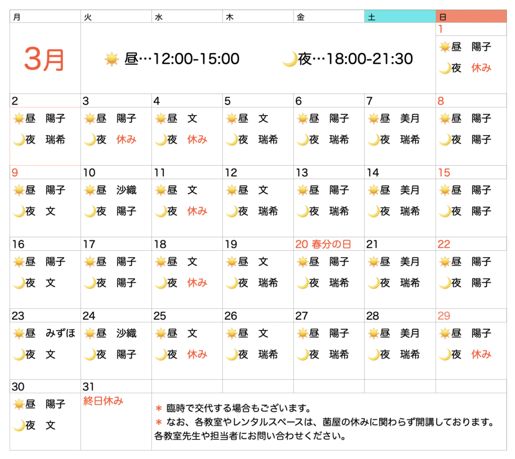 3月の菌屋の営業時間と、日々ごとの担当スタッフのお知らせです。